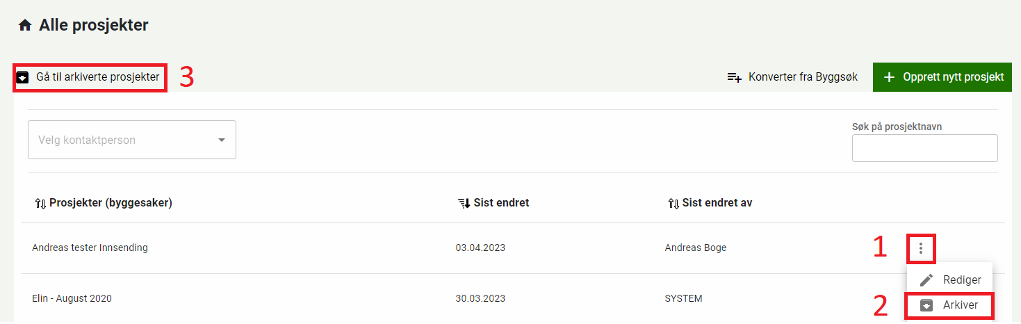 Har man arkivert et prosjekt, kan man finne de igjen ved å gå til arkiverte prosjekter (3).