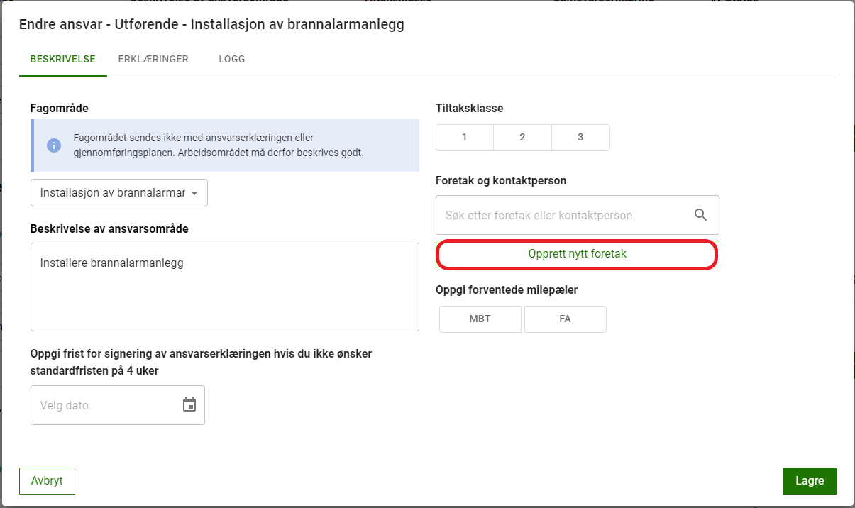 For å få lagt til et ansvarlig foretak på et ansvar må foretaket først være registrert i kontaktlisten. Foretaket må også ha minst en kontaktperson registrert.