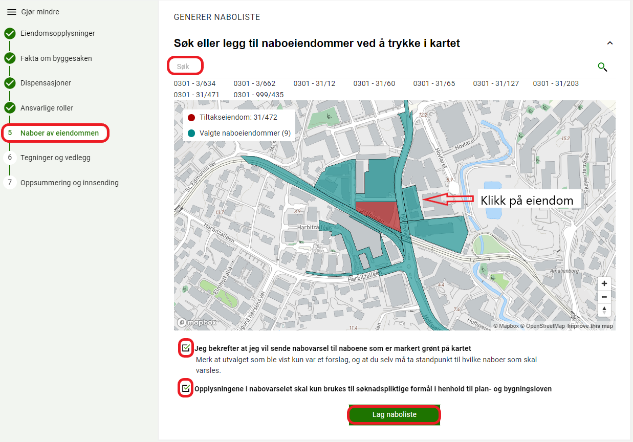 - Når sjekkboksene under kartet er huket av blir knappen 'Lag naboliste' aktiv.