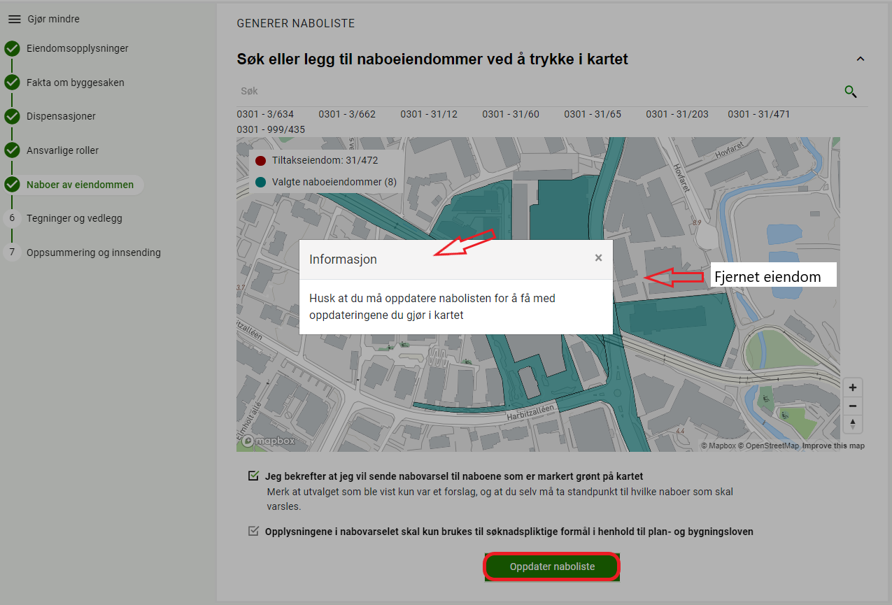 Dersom du legger til eller fjerner eiendommer etter at nabolisten er generert må du oppdatere listen ved å velge 'Oppdater naboliste'.