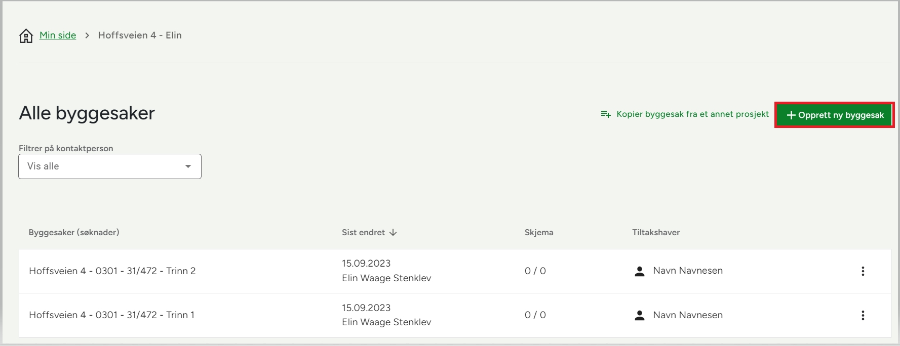 - Oversikten over alle byggesaker i dette prosjektet vises.