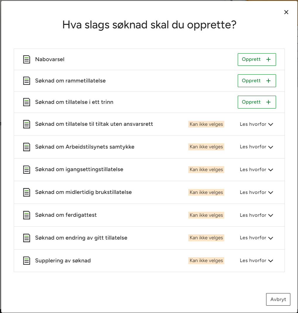 Velger du 'Opprett ny søknad' får du opp listen over alle tilgjengelige søknader (inkludert nabovarsel) for valgte tiltakstype.