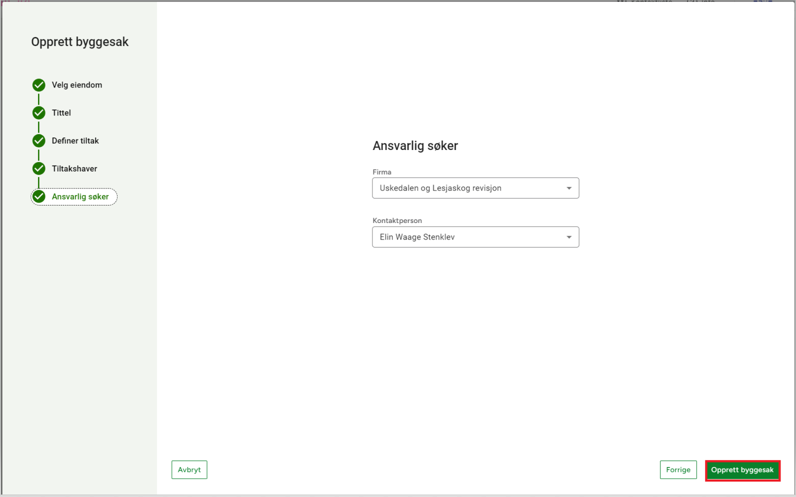 - Under Ansvarlig søker, trykker du 'Opprett byggesak'.