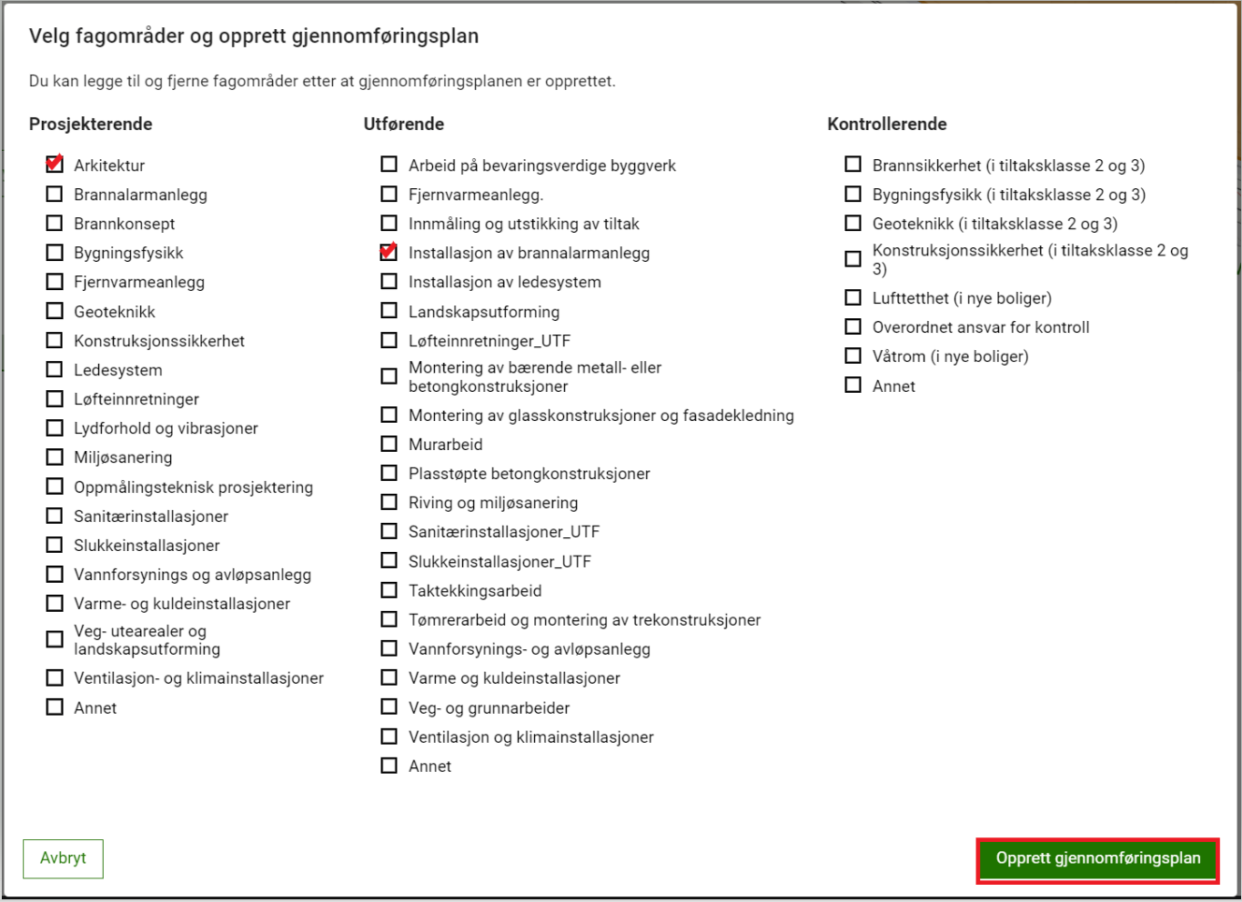Velger du 'Opprett gjennomføringsplan' kan du starte med oppbygningen av den ved å velge ansvarsområder og trykk 'Opprett gjennomføringsplan'.