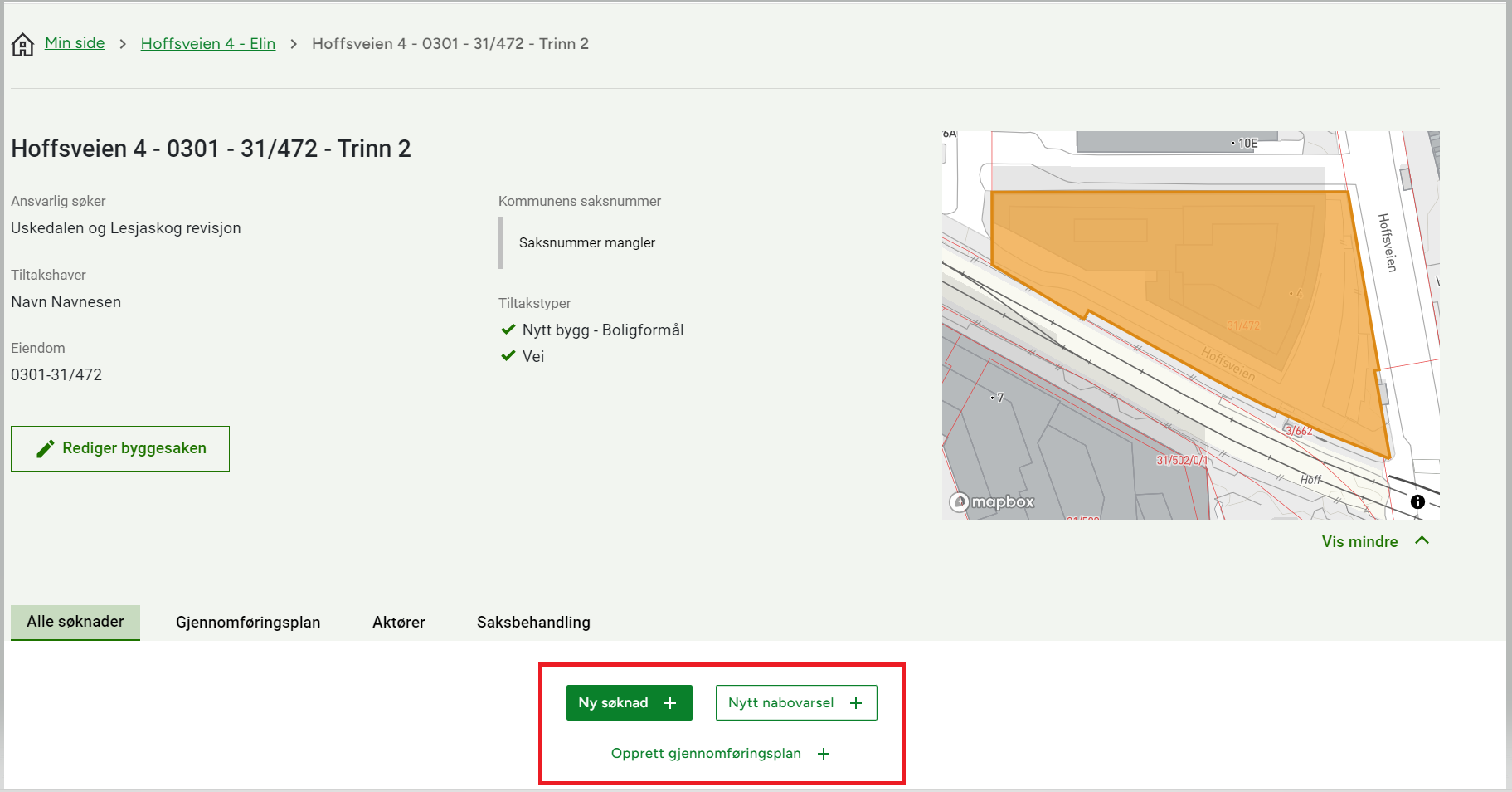 Byggesaken er opprettet og du kan velge å starte med en søknad eller et nabovarsel. Du har også muligheten til å begynne rett på gjennomføringsplanen.