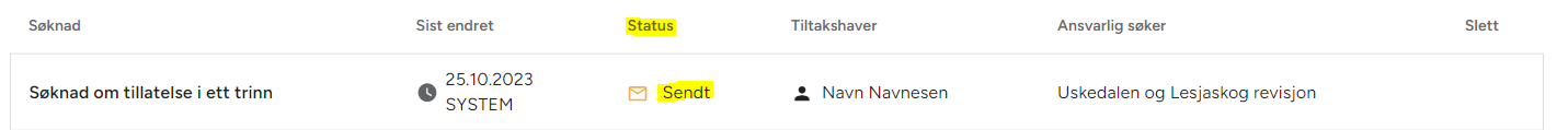 Etter søknaden er sendt vil status oppdateres med enten "Sendt" eller "Registrert".
