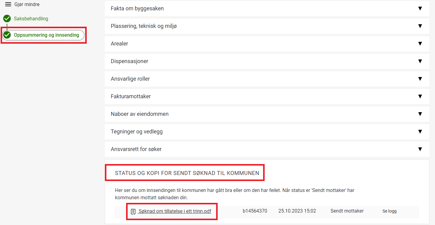 Etter søknad er sendt kan du åpne søknaden og finne en kopi av den sendte søknad under "Oppsummering og innsending"