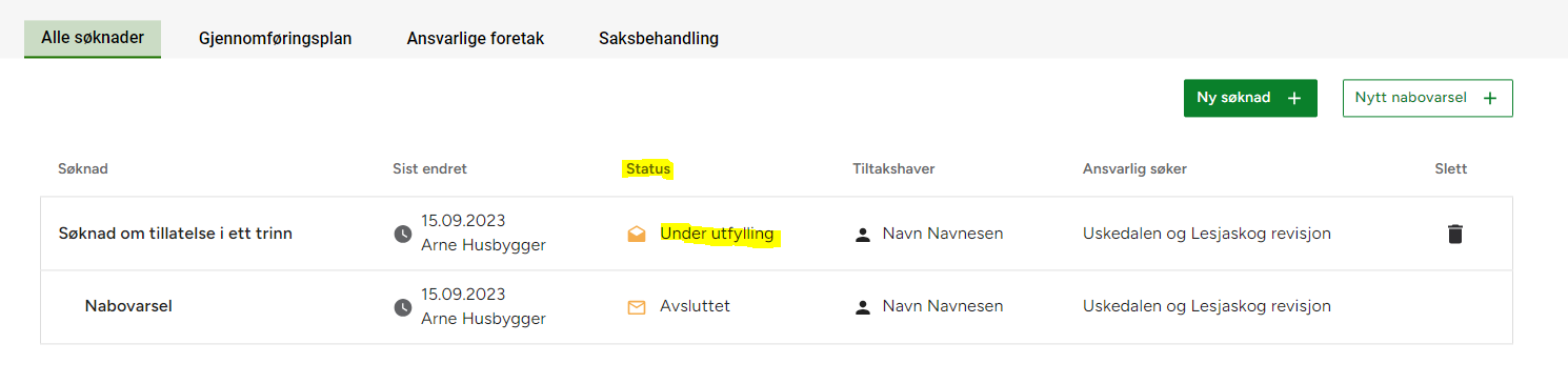 På alle søknader i en sak er det et status felt. Har den påbegynte søknaden statusen "Under utfylling" er den fortsatt mulig å redigere, og ikke sendt til kommunen enda.