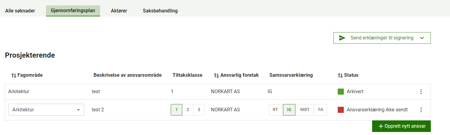 Etter at ansvaret er avsluttet kan du ikke gjøre endringer i ansvar- eller samsvarserklæringer uten at ansvar- og samsvarserklæring signeres på nytt.