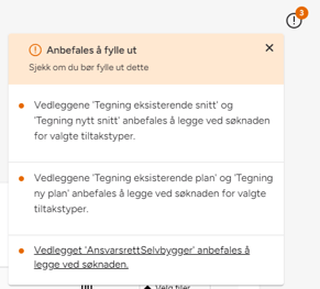 Vi har gjort en redesign og omskriving av feilvarslene som vises underveis i utfylling av skjemaene. Som alltid er det dynamisk varsling, slik at det oppdateres underveis som du fyller ut søknaden, men vi har forbedret responsen og designet slik at det skal bli enda tydeligere hva som er påkrevde felt for å få sendt inn søknad og hva som er anbefalinger for å få en mest mulig komplett søknad.