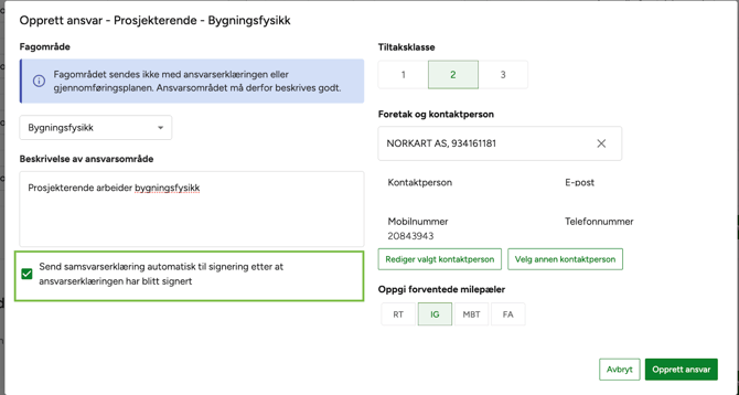 - Mulighet for å sende melding til ansvarlig foretak ved sending av ansvarsrett til signering