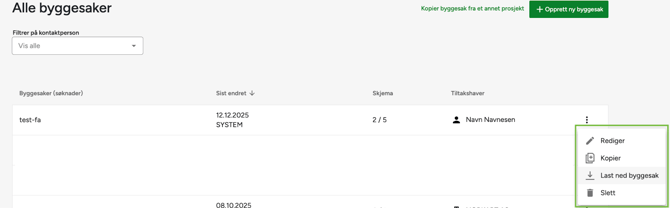 På byggesaksoversikt-siden får du valget når du trykker på de tre prikkene på slutten av byggesaks-raden.