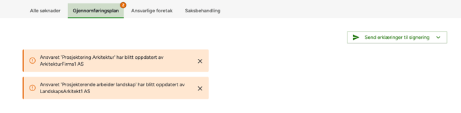 I noen tilfeller gjør ansvarlig foretak endringer på ansvarserklæringen før de signerer. Tidligere har du fått denne informasjonen på mail og kunne sett det i loggen for ansvaret, men nå har vi lagt til bedre varsling slik at det blir tydeligere for deg hvilke erklæringer du kan ta en ekstra titt på før neste fase.