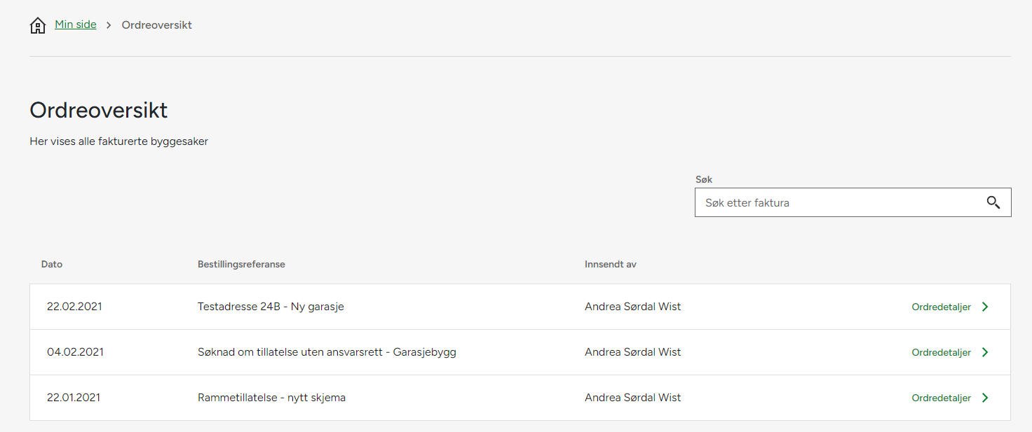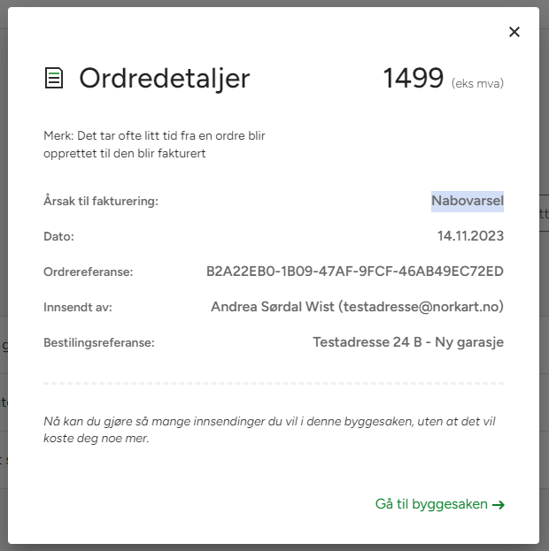 Ved å gå inn på ordredetaljer ser du info om hvilken innsending du ble fakturert for først og andre detaljer som vises på faktura som sendes ut - samt link til den aktuelle byggesaken.