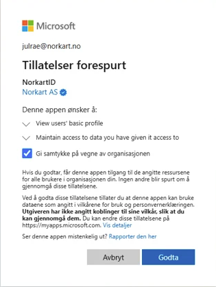 By approving the application, you allow NorkartID to use Entra ID for user identification. This gives NorkartID access to the following information: