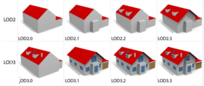 Bygningsmodellene man får på e-Torg kan forventes å ha en LOD på 2.2 ihht bildet under: