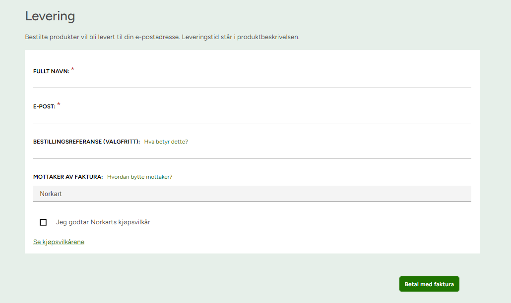 Fakturamottaker for dine bestillinger på e-Torg.no er alltid det firmaet brukeren din er tilknyttet. Når du bestiller produkter, vil feltet "Mottaker av faktura" vise dette firmaet.