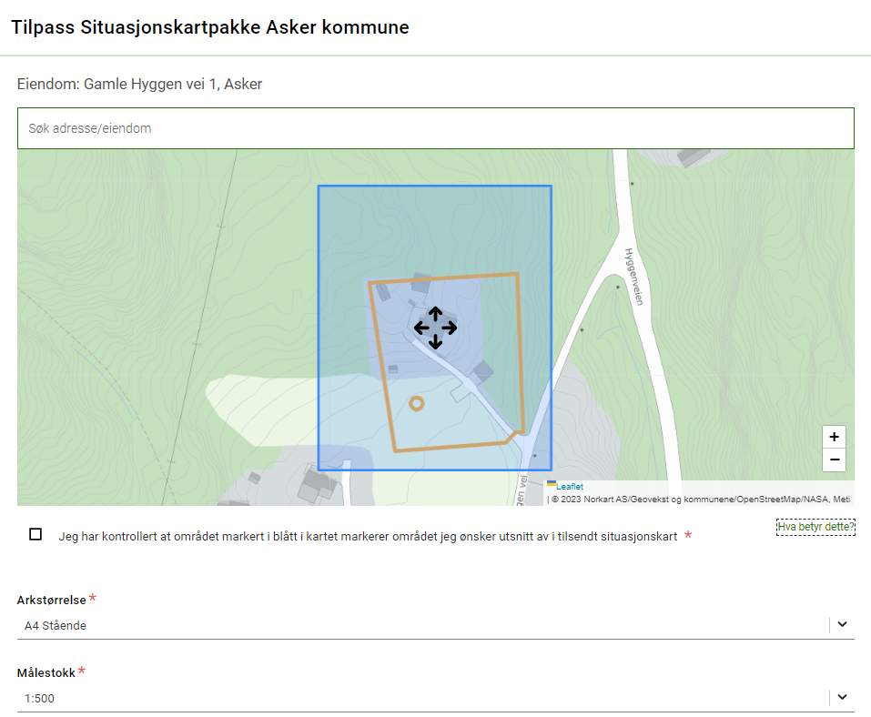 Du kan dra det blå området til ønsket posisjon i kartet. Det blå området i kartet viser hvilket utsnitt du vil motta i din leveranse. Det er ikke mulig å endre på dette etter bestilling.