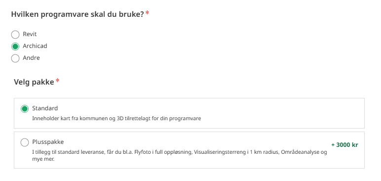 Før du bestiller, velg Archicad som programvaren du skal importere 3D-modellen i. Våre kartpakker er optimalisert for Archicad, slik at du slipper unna unødvendig tilpasningsarbeid og kan starte prosjekteringen med en gang.